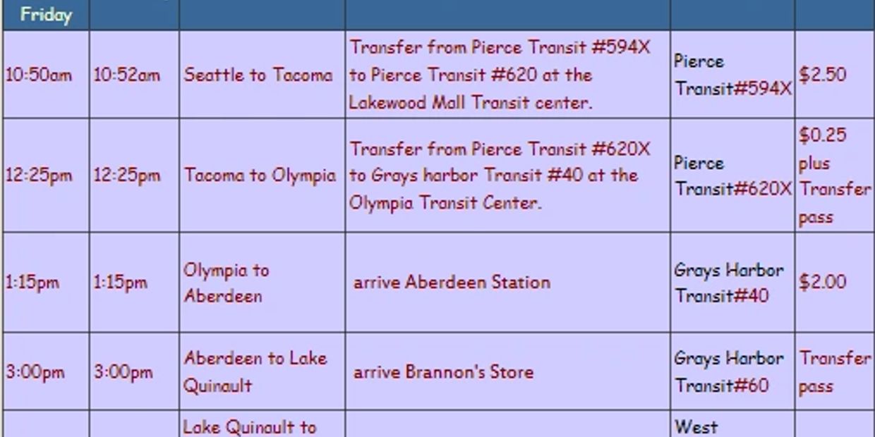 Easy and inexpensive public transportation to The Rain Forest Hostel from:Seattle to The Rain Forest Hostel Southern Route- via Tacoma, Olympia and Aberdeen:Beginning at 9th and Stewart, 2nd and Virginia, or 2nd and Union in Seattle,board the Pierce Transit #594
