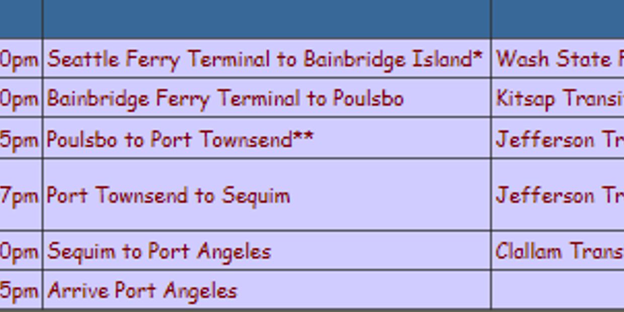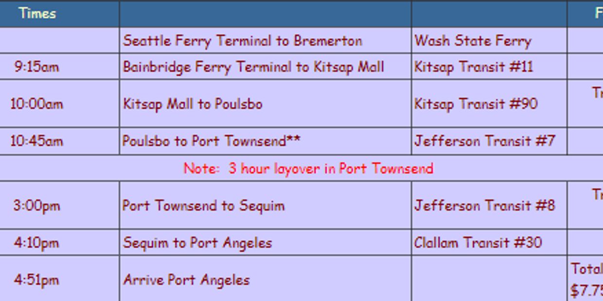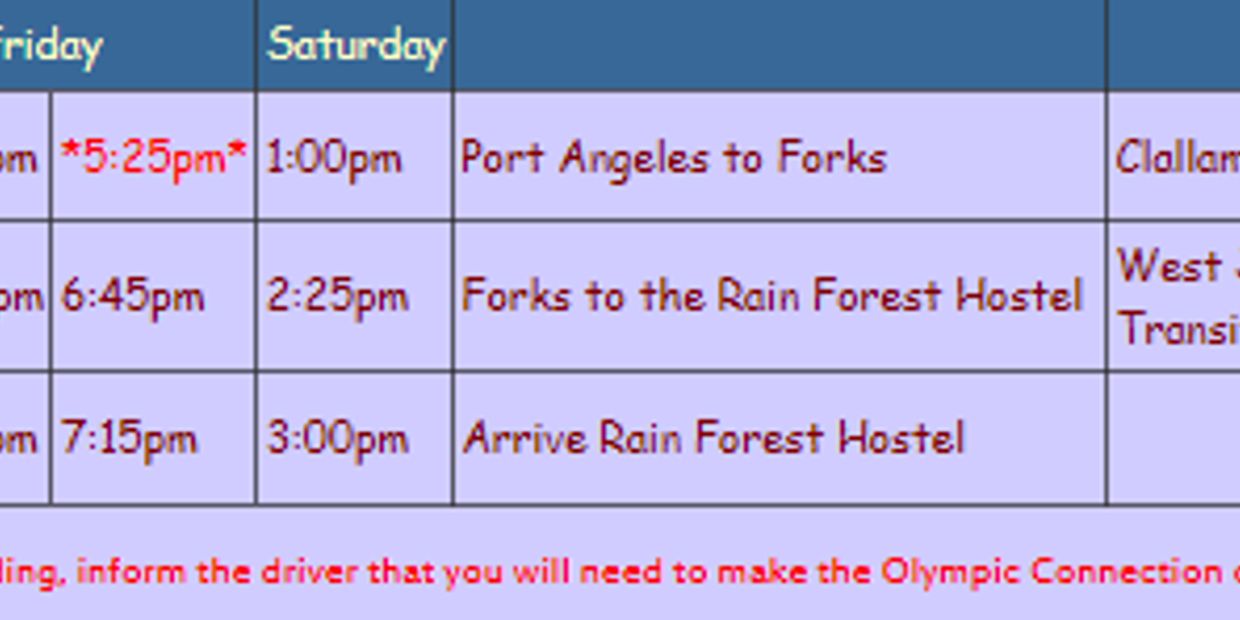 *The Seattle to Bainbridge ferry runs every 30 to 50 minutes. Times listed are those which provide the most convenient connections with buses connecting to Port Angeles.**The Olympic Hostel (Hostelling International) is located in Port Townsend. To stopover there, transfer to Jefferson County bus #5 and ride to the hostel in Fort Worden State Park.Port Angeles to the Rain Forest Hostel
